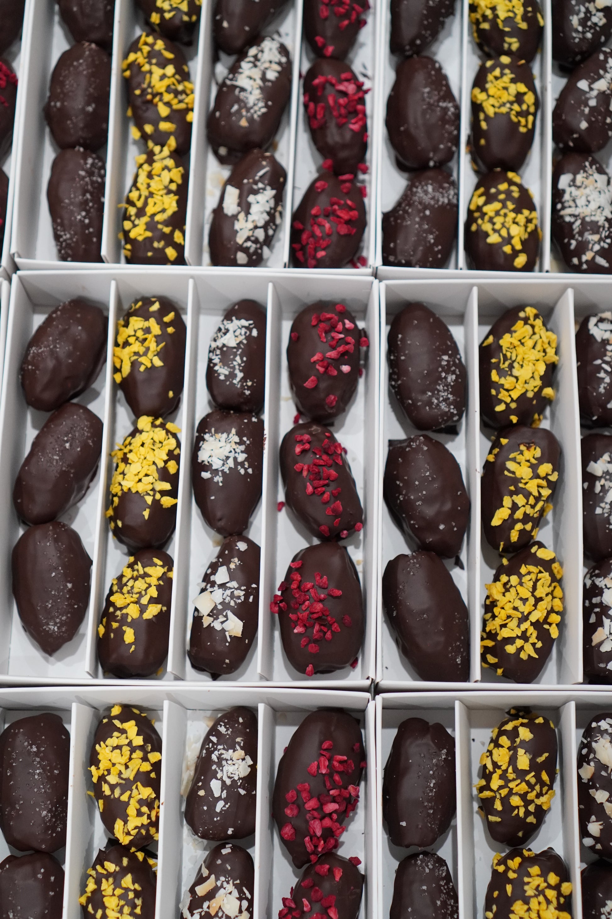 - 3 Dates filled with hazelnuts, covered in 100% cacao, and topped with freeze-dried mango.
