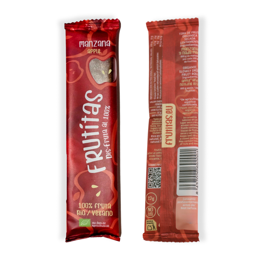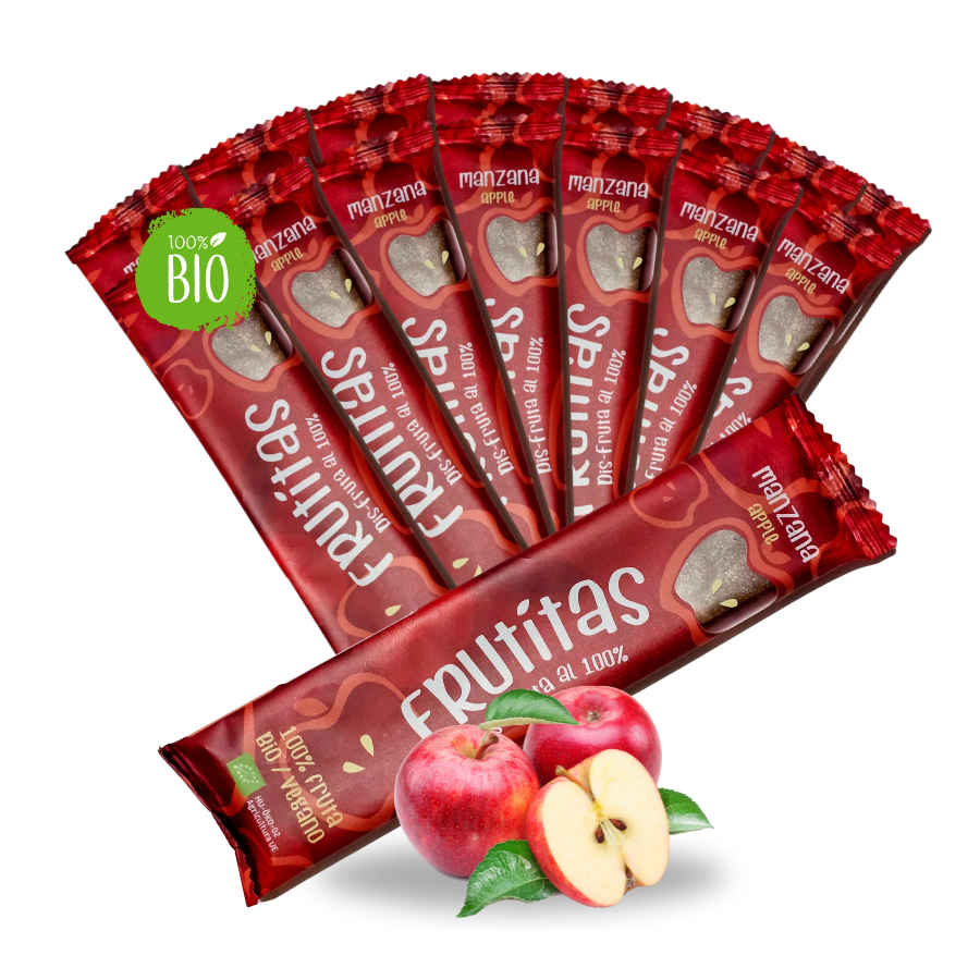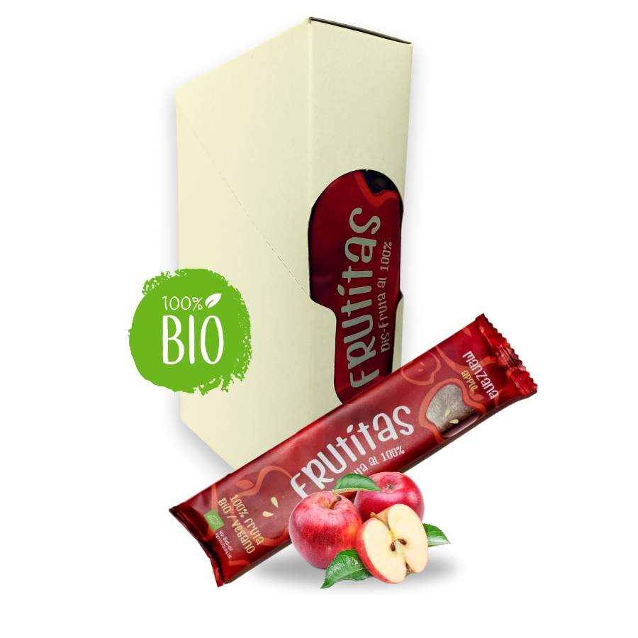 Discover Frutitas of organic Apple, a healthy, 100% natural, organic and vegan snack. Frutitas of Apple are a nutritious snack with an intense flavor, ideal for those looking for a healthy and unique option. This product, made with carefully selected apples, offers a sweet and slightly sour flavor that is appreciated by both children and adults.