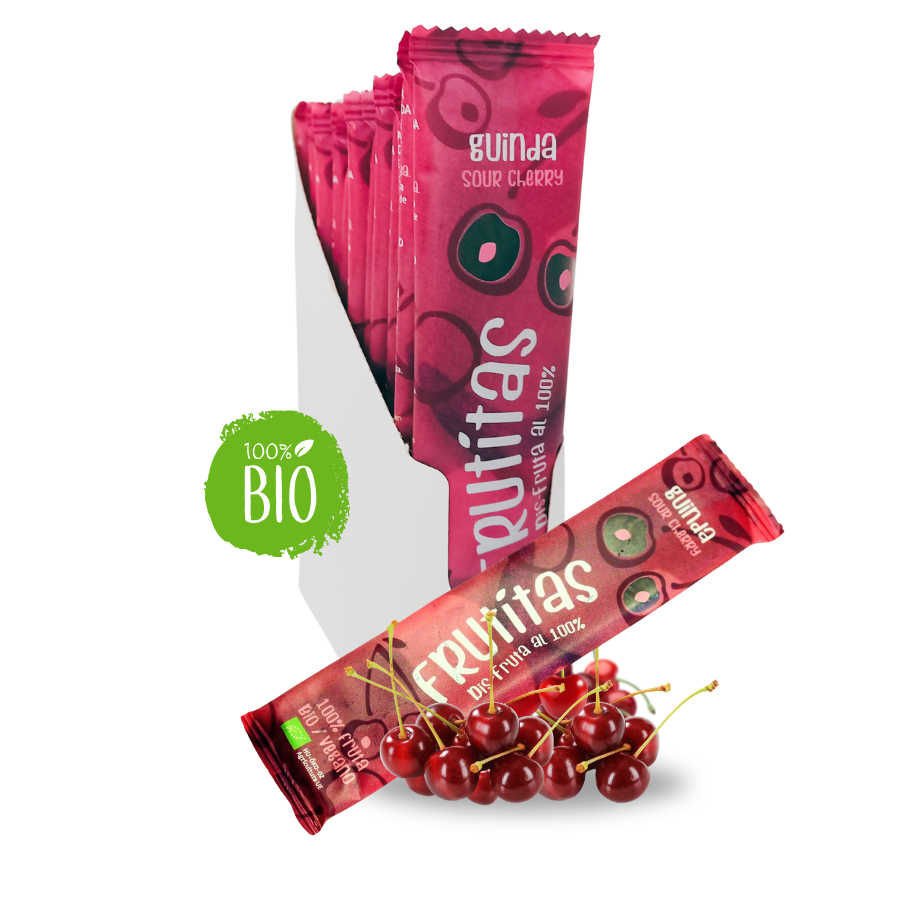 Frutitas of organic Cherry is a delicious organic and healthy snack, 100% natural, with no added sugar or additives, making it a perfect choice for those looking for a natural and healthy sweet.