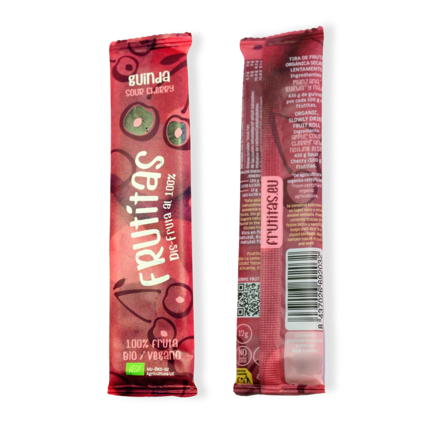 Frutitas of organic Cherry, Ingredients: Apple, Cherry and nothing else—435g of cherry per 100g of Frutitas. Each Frutitas snack offers valuable nutrients in a concentrated form, making it the perfect choice for a healthy, natural snack. The fruit leather tongues are made with 100% natural ingredients, carefully selected and processed using slow drying. Thanks to the traditional low-temperature drying process, the nutrients and rich flavor of the fruit are preserved, so Frutitas is not only delicious but nutritious as well.